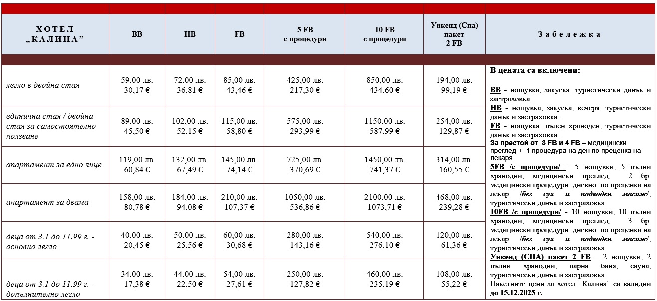 Специализирани програми: Хотел „Калина“ работи по програмата на НОИ за профилактика и рехабилитация на осигурените лица.
